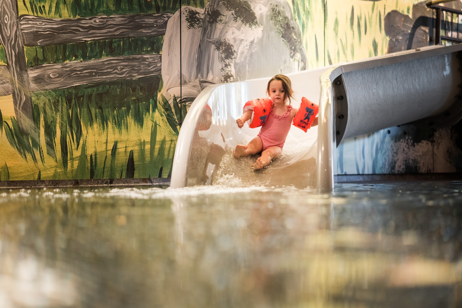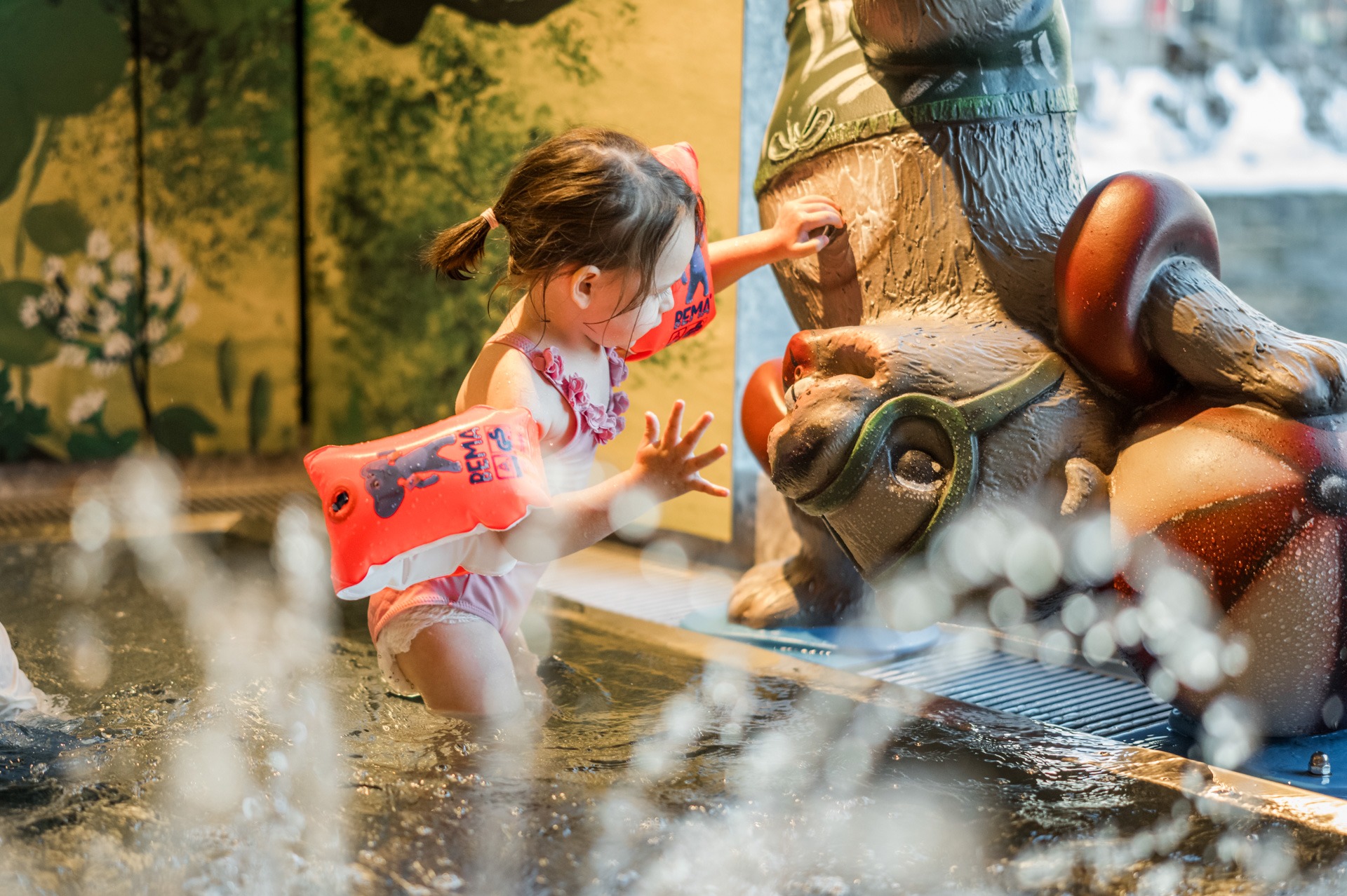 Auf drei Ebenen entdecken kleine Abenteurer vier Wasserrutschen, Wasserspielplatz und Indoor- bzw. Outdoorpool, während das kuschelige Familiennest zum gemeinsamen Entspannen einlädt.