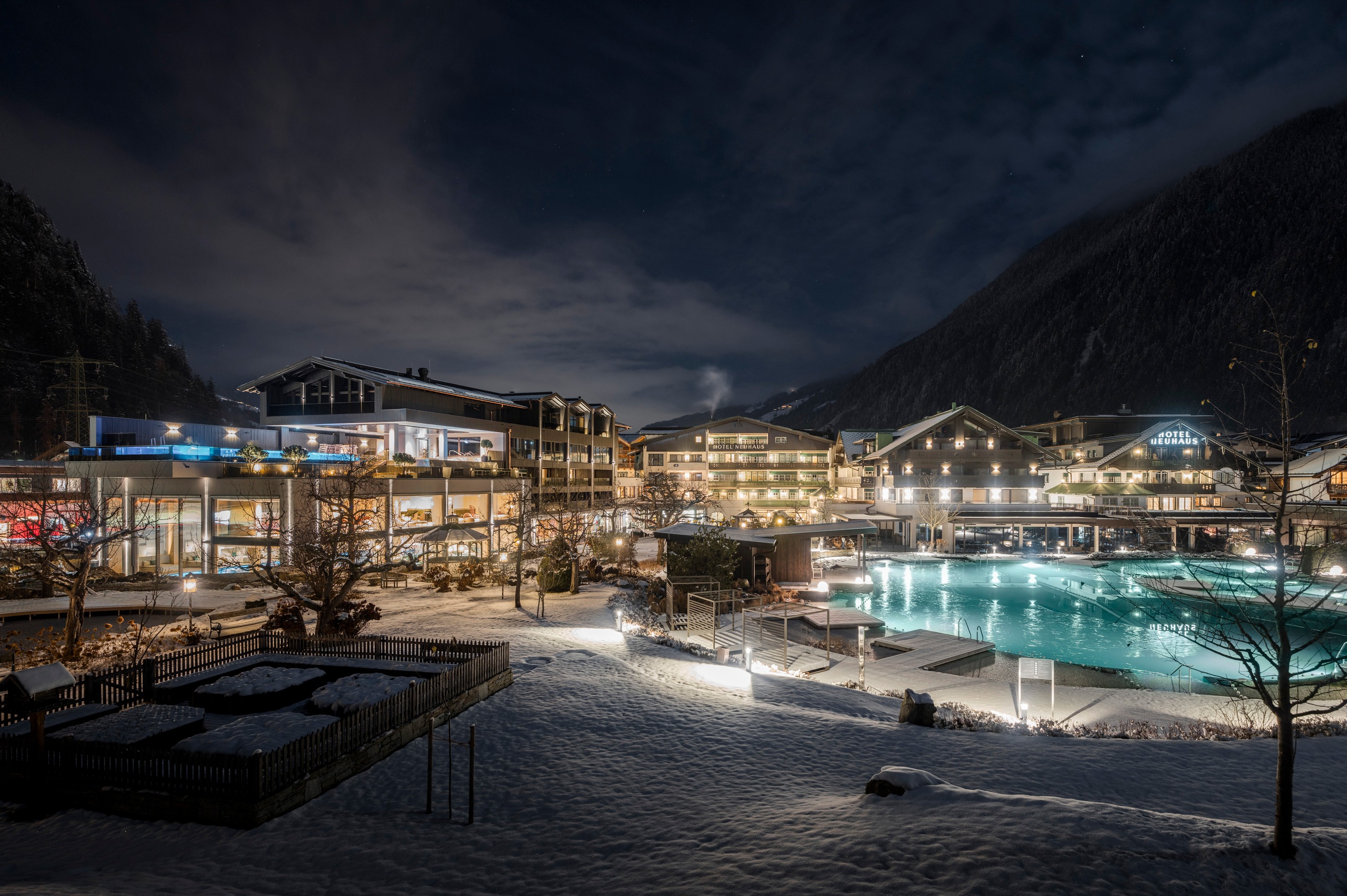 Wenn die Zillertaler Bergwelt ihr weißes Kleid trägt, wird das Neuhaus Zillertal Resort zum wärmenden Rückzugsort. Seit 1649 empfängt Familie Moigg Gäste mit echter Tiroler Herzlichkeit. Nach erlebnisreichen Stunden in der Natur erwartet Sie das neue 5.800 m² große Badehaus mit zwei 25 Meter langen Pools und wohltuenden Saunen. Am Abend verwöhnt die Küche mit regionalen Spezialitäten.